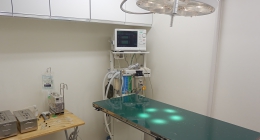 手術を行う部屋です。奥に見えるのが麻酔器、及び生体情報モニターです。モニターには心拍数や心電図、呼吸数、血圧、動脈血酸素飽和度、CO2濃度、吸入麻酔薬濃度等の情報が表示され、安全に手術を行います。
